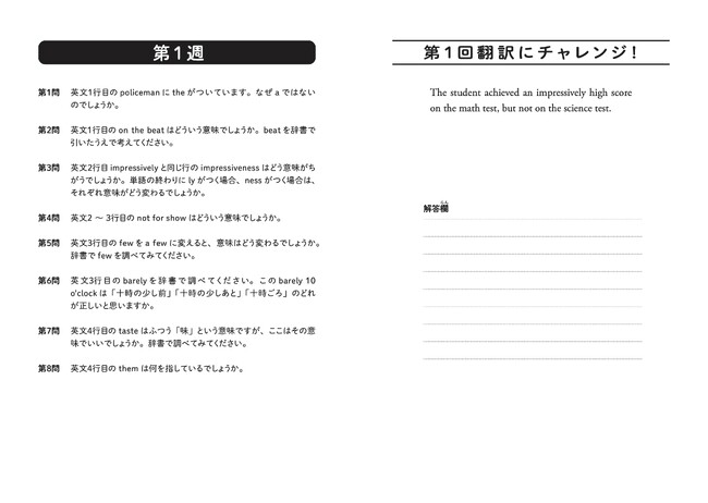 翻訳はどのくらい使える?/品詞の名前を覚えよう/だれでも得意、不得意はあっていい/theとaのちがい、「は」と「が」のちがい/「予想する力」と「選ぶ力」/接尾語をたくさん知っていると便利/andで何と何が並ぶか/多いのか、少ないのか/辞書を引くのは大事だけど、同じくらい大事なのは……/知らない単語が多くてもあきらめない