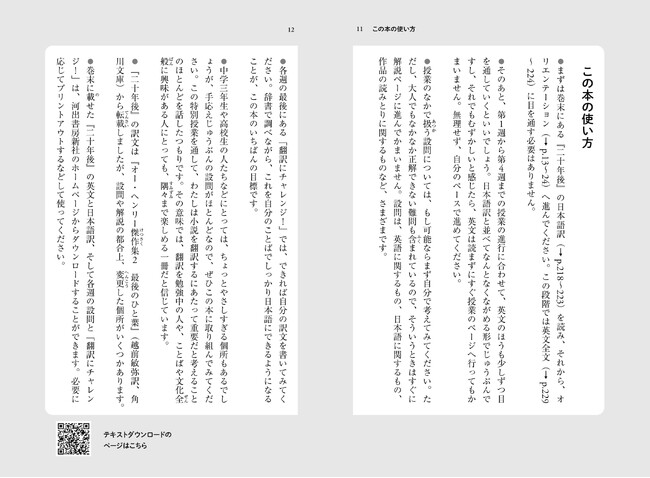 本書では、巻頭にある「この本の使い方」に沿って授業参加が始まり、まずは巻末にある『二十年後』の日本語訳全訳を読みます。そして本文に入りますが、本書では5日間の講義を5週に見立てて進んでいきます。なお、巻末に掲載の『二十年後』の英文と日本語訳、そして各週の設問と「翻訳にチャレンジ!」は、河出書房新社のホームページからダウンロードが可能です。