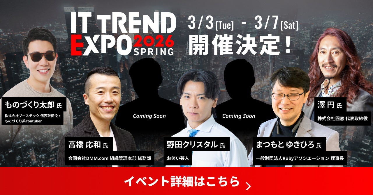 \ 2026年3月3日(火) 〜 7日(土) /業界最大級オンライン展示会「ITトレンドEXPO2026 Spring」申込み受付中 業界第一線で活躍するビジネスリーダーが多数登壇決定!