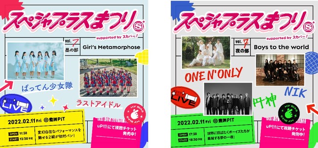 3回目となる今回は、2022年2月11日(金・祝)に豊洲PITで、昼の部、夜の部の2部制にて、有観客公演にあわせ生配信を実施。出演は、昼の部-Girl’s Metamorphose-と題して、九州を拠点に活動する、多彩な楽曲とパフォーマンス力でめきめきと頭角を現すスターダストプロモーションのアイドルグループ”ばってん少女隊”と、地上波アイドルオーディション番組から誕生し、楽曲によって入れ替えバトルを行うなど日々切磋琢磨するアイドルグループ “ラストアイドル” (※選抜メンバー)の2組が出演。対バンは今回が初となります。そして夜の部は、-Boys to the world- と題して「スペシャプラスまつり」初開催時にも出演、現在TikTokでも人気沸騰中”JK-POP“として唯一無二のスタイルを貫くダンス&ボーカルユニット“ONE N' ONLY”、ユナク(SUPERNOVA)プロデュースによる11人組日韓合同グローバルグループ“NIK”、現在様々なジャンルで活躍中のPRODUCE 101 JAPAN候補生から成るパフォーマンスユニット“円神”の計3組。日本のみならず世界も虜にすること間違いなしのボーイズグループが集うスリーマンライブイベントとしてお届けします。なお、NIKはライブステージには、韓国メンバーもリモートでイベントに参加!グループ全員で本イベントを盛り上げます。