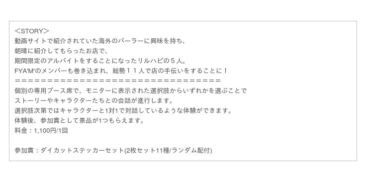 録り下ろしボイスでイベント限定シナリオが楽しめる対話型デジタルアトラクションです。アトラクションでは、フルーツパーラーで接客をする 「リルハピ」や「FYA‘M‘(フェイム)」のメンバーたちと、対話の疑似体験をお楽しみいただけます。