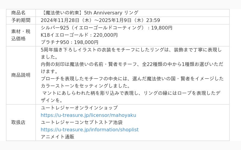 株式会社ユートレジャー(本社:東京都新宿区、代表取締役:伊藤 崇史)は、株式会社coly(本社:東京都港区、代表取締役:中島 杏奈)が配信するゲームアプリ『魔法使いの約束』とのコラボレーションリング(指輪)の予約受付を、2024年11月28日(木)〜2025年1月9日(木)の期間、ユートレジャーオンラインショップ、ユートレジャーコンセプトストア池袋にて行います。