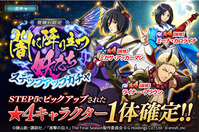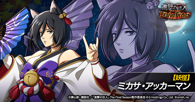 株式会社enish(本社:東京都港区、代表取締役社長:安徳 孝平、以下enish)は、アニメ『進撃の巨人』のスマートフォンゲーム最新作「進撃の巨人Brave Order」にて、8月31日(木)より、新イベント「闇に降り立つ妖たち」を開催!イベントミッションを進めてアニの限定衣装やイベントガチャ券を手に入れよう!また、本日より新登場の【妖怪】ミカサ・アッカーマン、【妖怪】ライナー・ブラウン、【妖怪】ミーナ・カロライナがピックアップされた「闇に降り立つ妖たちガチャ」も開催!さらに、ウォール・ローゼ防衛戦に新巨人登場!他にも「秋の成長応援!もぐもぐキャンペーン」等々盛りだくさん!その他、最新情報はゲーム公式サイト・ゲーム公式Twitterアカウントにて随時公開して行きますので、ぜひご覧ください。