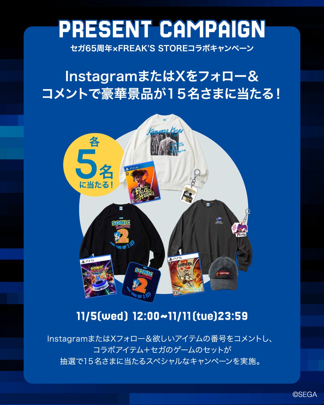 - SNSフォロー&コメントで豪華景品が15名さまに当たる『セガ65周年×FREAK'S STOREコラボキャンペーン』