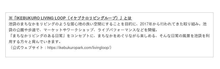 本プレーパークは、池袋東口エリアを中心に、リビングのように居心地の良いまちなかを目指すプロジェクト「IKEBUKURO LIVING LOOP(イケブクロリビングループ)※」のサブ会場として、ダンボールを使った遊び場やSDGsワークショップなど、遊び・学ぶことができる様々なコンテンツを展開し、ウォーカブルなまちづくりを推進している豊島区とともに東池袋エリアの活性化と回遊性向上を目指します。