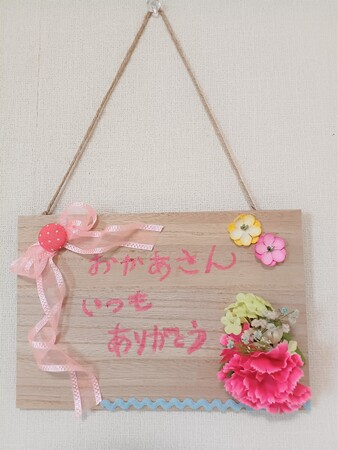 壁にかけられる木のボードにメッセージ・似顔絵を描いたり、アーティフィシャルフラワー(造花)やロスフラワー(廃棄されてしまうお花)、リボン、マスキングテープなどで飾り付けたりして作成します!