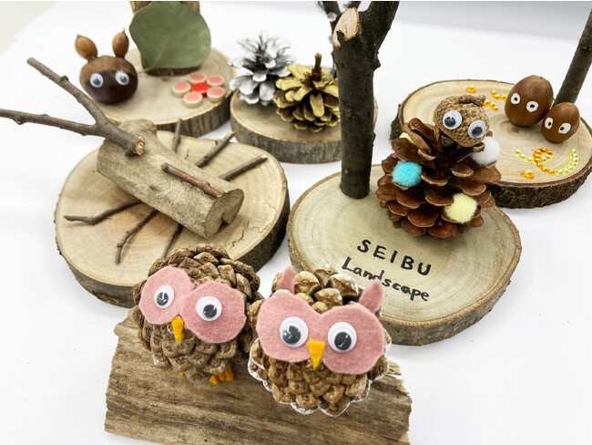 公園や森林の植物管理で発生した間伐材(かんばつざい)や、木の実・枝などを再利用して、世界に一つだけの作品「アースアート」を作ります。サンドペーパーで木材の表面を磨いたりイラストを描いたり、自然素材の飾りつけを楽しもう!
