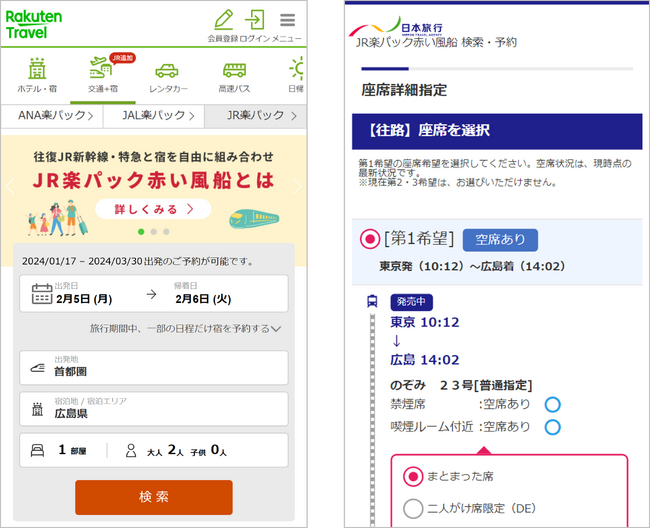「楽天トラベル」の「楽パック」の商品を掲載するページ上に、新幹線のイメージをあしらった「JR楽パック赤い風船」の専用ページを新たに公開しました。旅行者は、パソコンやスマートフォンから本ページにアクセスし、行き先や日程を入力するだけで、いつどこからでも、対象の宿泊施設、宿泊プランとJR新幹線・特急を一覧で見ることができます。希望の商品を組み合わせ、日本旅行のサイトに移動して座席指定と決済を行うと、予約が完了します。JR新幹線・特急のチケットは、駅にある発券可能な指定席券売機で受け取りが可能です。予約には楽天IDを活用(※1)するため、旅行者情報の入力や会員登録の手間なく、検索から予約、決済までをシームレスに行うことができます。