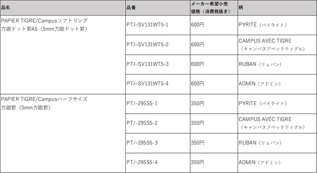 ラインアップは、鉱石(黄鉄鉱)がモチーフのグラフィック「PYRITE(パイライト)」、キャンパスとPAPIER TIGREのコラボレーションを表現したオリジナルデザイン「CAMPUS AVEC TIGRE(キャンパスアベックティグル)」、フランス語で“リボン”を意味し、リボンで幾何学模様を表現したデザイン「RUBAN(リュバン)」、フランス語で“管理”を意味し、日本やフランスの学校やビジネスシーンで使われていたクラシックなノートからインスパイアされたデザイン「ADMIN(アドミン)」の4柄です。
