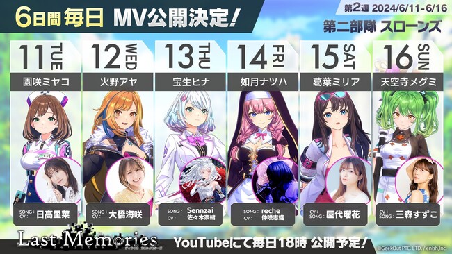 『De:Lithe Last Memories(ディライズ ラストメモリーズ)』の第二部隊「スローンズ」に所属する園咲ミヤコ、火野アヤ、宝生ヒナ、如月ナツハ、葛葉ミリア、天空寺メグミのキャラクターソングを6月11日より6日間、毎日18時にラスメモ公式Youtubeチャンネルにてプレミア公開いたします。どなたでも無料で参加いただくことができます。ぜひご覧ください。
