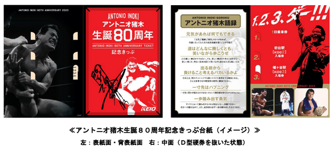 「アントニオ猪木生誕80周年記念きっぷ」は、アントニオ猪木氏のイメージカラーである赤色を基調とし、往年のファイトシーンなどの写真や「アントニオ猪木語録」をデザインに取り入れた台紙に、アントニオ猪木氏の掛け声「1、2、3、ダー!!」にちなんだ「京王線・井の頭線“1”日乗車券」「初台駅(駅ナンバリングK0“2”)入場券」「幡ヶ谷駅(駅ナンバリングKO0“3”)入場券」のD型硬券3枚をセットにしたものです。