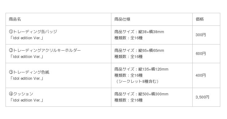 第一弾のグッズ情報として公開した、缶バッジやアクリルキーホルダー、トレーディング色紙、クッションなどに加え、今回新たに、各アイドルユニットのグッズが詰め込まれたファン必見のスペシャルセットと、山田シロ先生描き下ろしメインビジュアルを使用したクリアファイルも販売することが決定しました。なお、6,000円(税込)以上をご購入いただいた方には、一日先着200名様限定でオリジナルのノベルティ(商品サイズ:縦320×横440mm、種類数:全1種)をプレゼントします。