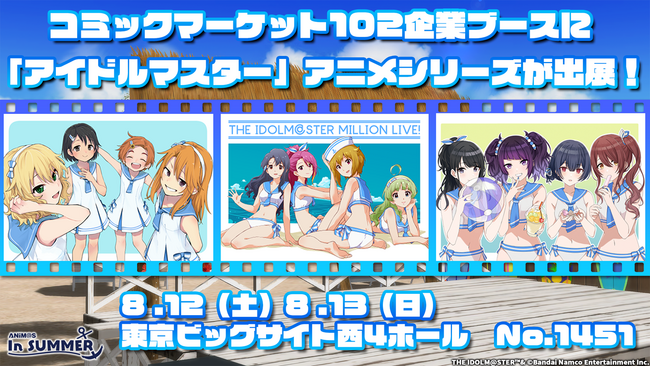 『ANiM@S in SUMMER』をテーマに、TVアニメ「アイドルマスター シンデレラガールズ U149」、アニメ「アイドルマスター ミリオンライブ!」、アニメ「アイドルマスター シャイニーカラーズ」の3作品合同で企業ブースへ出展いたします。