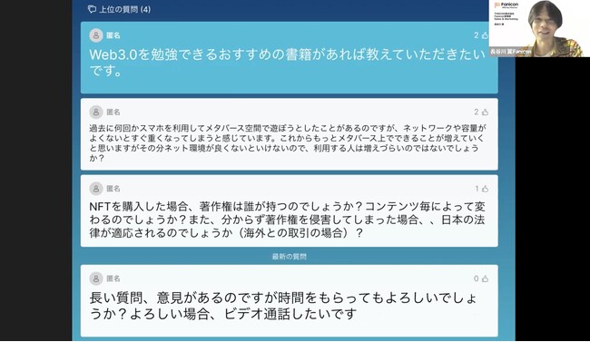 最終回のゼミ後には学生からの質問も多く、『NFT(デジタルコンテンツ)を購入する時や、メタバース上でトラブル等が起こる事が考えられると思うのですが、法整備は整っているのでしょうか?』
