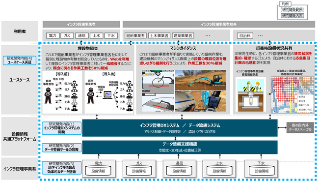 (1)(2)(3)の成果物を活用したインフラ管理DXシステムを用いた、埋設物照会、掘削工事における建設機械向けマシンガイダンス、災害時情報共有の3つの地下インフラ情報の連携に係るユースケースを実行するためのシステム開発、業務効率化等の検証