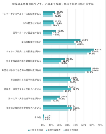 小学生保護者・中学生保護者・高校生保護者とも、「ネイティブ教員による授業数が多い」が最も多かった。次いで、「希望者が参加できる海外研修制度がある」も、半数以上の保護者が魅力的だと思っていることが分かった。