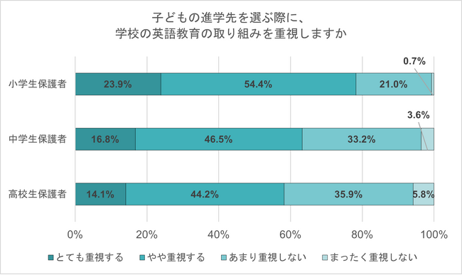 小学1年生〜高校3年生の保護者に、子どもの進学先を選ぶ際に、学校の英語教育の取り組みを重視するかを聞いた。「とても重視する」「やや重視する」と回答したのは、小学生保護者の78.3%、中学生保護者の63.3%、高校生保護者の58.3%だった。子どもの年齢が低いほど、学校の英語教育の取り組みを重視する傾向が見られた。