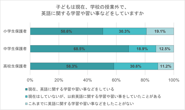 小学1年生〜高校3年生の保護者に、子どもは現在、学校の授業外で、英語に関する学習や習い事をしているか、聞いたところ、小学生保護者の50.6%、中学生保護者の68.5%、高校生保護者の58.3%が「現在、英語に関する学習や習い事などをしている」と回答した。また、小学生保護者と高校生保護者の約3割が「現在はしていないが、以前英語に関する学習や習い事をしていたことがある」と回答した。