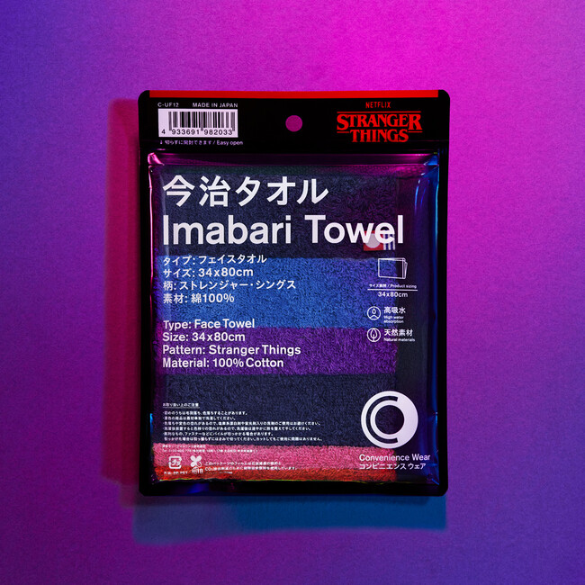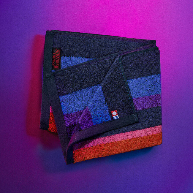 【内容】「ストレンジャー・シングス 未知の世界4」のポスターカラーをモチーフに配色したフェイスタオルです。今治クオリティで高吸水、天然素材です。