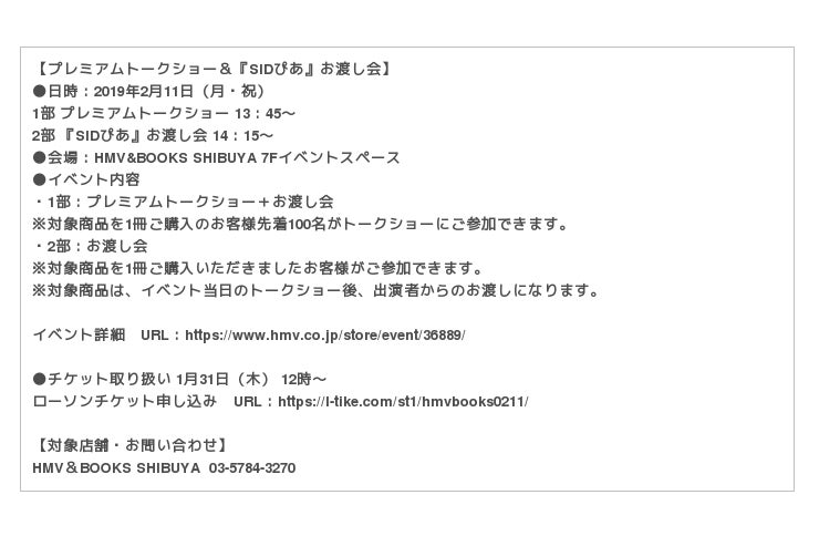 また、本書の発売を記念したイベント「プレミアムトークショー&『SIDぴあ』お渡し会」を2月11日(月・祝)にHMV&BOOKS SHIBUYAにて、500名限定で開催。プレミアムトークショーに参加できるのはこのうち100名限定となります。イベント参加券は明日1月31日(木)12時より先着で購入受付。詳細はHMVオフィシャルサイト掲載されています。