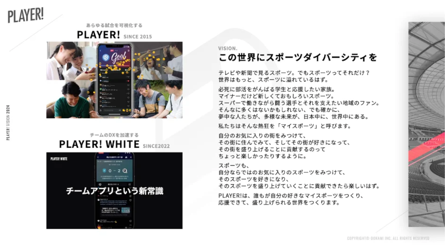 ??事業内容:スポーツコミュニティアプリ「Player!」および「Player! WHITE」の開発・運営、スポーツ情報インフラの開発・運営