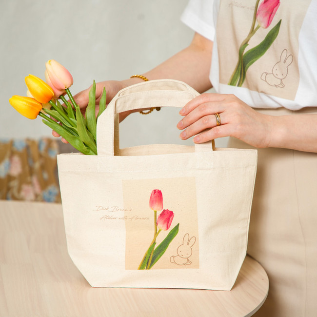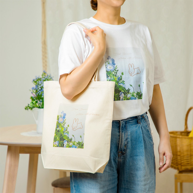 フラワーミッフィー サンシャインシティアルパ店で扱う生花を撮影し、ミッフィーやうさぎのイラストをあしらった、フラワーミッフィーだけのフォトプリントデザインのシリーズです。チューリップとネモフィラのお花の二つのデザインで、トートバッグ、ランチトートバッグ、フラットポーチ、Tシャツのラインアップを発売いたします。
