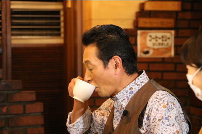 美章園を堪能した二人は一駅先の「南田辺」に。昭和レトロな雰囲気を残す純喫茶で、蒸気圧で抽出するサイフォン珈琲と手作りのコーヒーゼリーをいただきます。