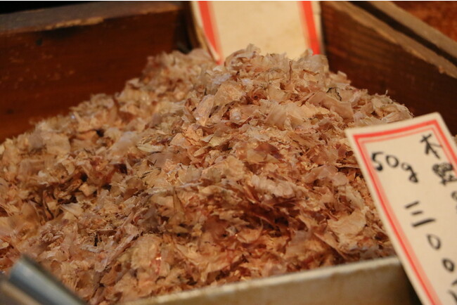 続いて今では珍しくなった鰹節の専門店へ。燻製された鰹をお店で削った鰹節の香ばしい香りを楽しみます。