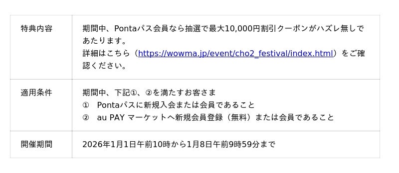 KDDIは、2026年1月1日から1月8日までの期間中、新春恒例のおトクなセール「新春ポイント超超祭」をau PAY マーケットにおいて開催します。期間中は購入金額や条件に応じて最大7%のPontaポイント(au PAY マーケット限定)を還元し、「三太郎の日(2026年1月3日)」や「お買い物ラリー(2026年1月3日〜6日)」の特典を組み合わせることで、最大46%のポイント還元となります。