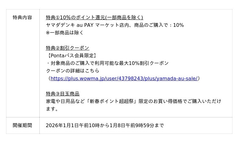 【Pontaパス】au PAY マーケットで2026年1月1日10時から「新春ポイント超超祭」開催、最大46%ポイント還元やマルイ・成城石井・ヤマダデンキとの特別コラボ企画を実施