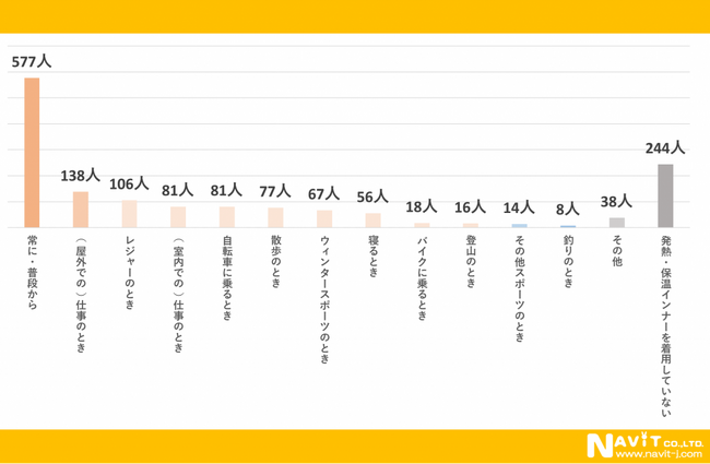 複数回答でいただいた、こちらのアンケートではどのような時に発熱・保温インナーを着るのかというアンケートに対して、1番多かったのが「常に・普段から」という回答が1番多く577人となっています。次に多かったのが「(屋外での)仕事のとき」で138人、続いて「レジャーのとき」が106人と続いています。やはり外に出る際に着る方が多いようです。