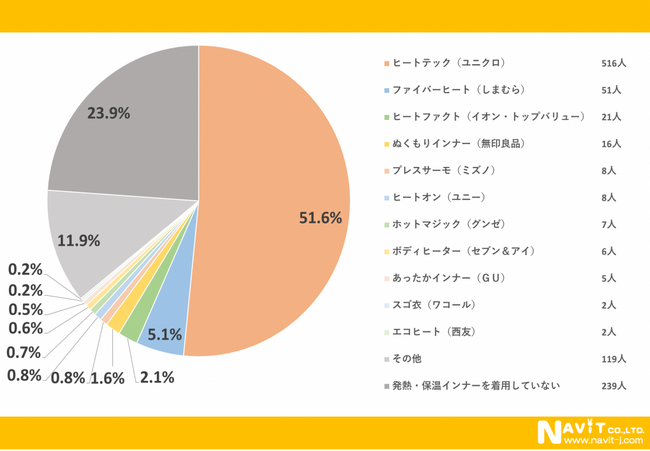 こちらのアンケートでは圧倒的に「ヒートテック(ユニクロ)」が1番多く51.6%となっています。続いて「ファイバーヒート(しまむら)」が5.1%人です。3番目に多かったのが「ヒートファクト(イオン・トップバリュー)」が2.1%となっています。やはりユニクロのヒートテックが圧倒的です。