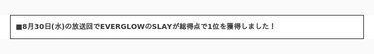 『SHOW CHAMPION』8月30日(水)の放送回(第489回)において、EVERGLOWのSLAYが、音源や音盤、アプリ投票、SNSスコア、放送スコアなどを反映した総得点で1位を獲得し、チャンピオンソングとして番組内で放送されました。