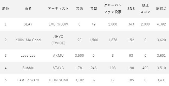 (※)各スコアの割合音源35%、音盤15%、グローバルファン投票(アプリ)20%、SNS10%、