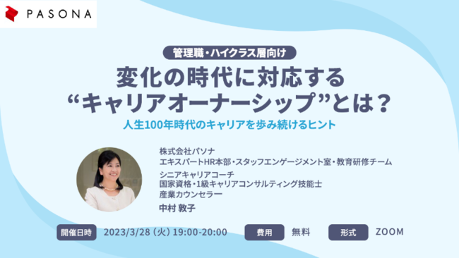 株式会社パソナ(本社:東京都千代田区、代表取締役社長:中尾慎太郎)は、管理職・ハイクラス層向けセミナー『変化の時代に対応する“キャリアオーナーシップ”とは?〜人生100年時代のキャリアを歩み続けるヒント〜』を3月28日(火)に開催いたします。