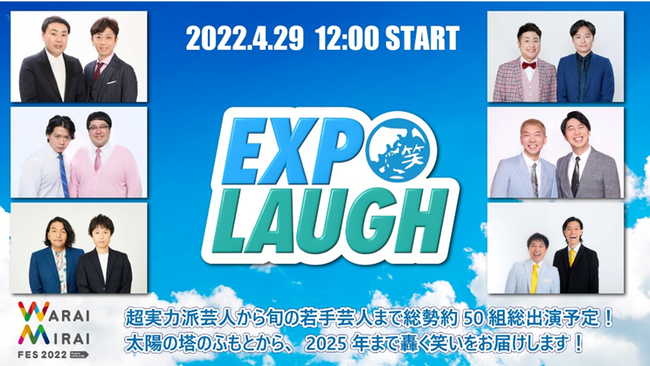 2022年4月29日(金祝)万博記念公園(お祭り広場)で開催のWarai Mirai Fes 2022 〜Road to EXPO 2025〜 M-stage DAY1EXPO LAUGHのオンラインによる特別配信「 Warai Mirai Fes 2022 EXPO LAUGH 」を生配信することが決定しました。