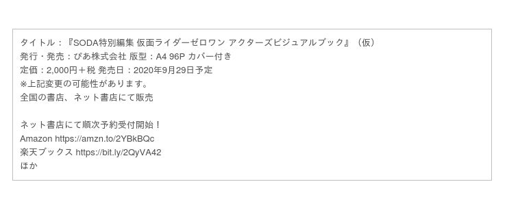 ぴあ株式会社より、『SODA特別編集 仮面ライダーゼロワン アクターズビジュアルブック(仮)』が、 9月29日に発売となることが決定いたしました。 (発売日は変更の可能性があります)