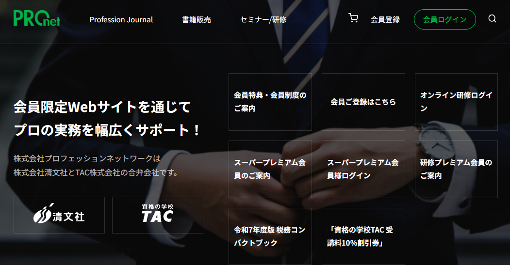 [画像3: https://prcdn.freetls.fastly.net/release_image/21078/1775/21078-1775-44b8e253b203f5dd8c457a67a363ddff-1051x547.png?width=536&quality=85%2C75&format=jpeg&auto=webp&fit=bounds&bg-color=fff ]株式会社プロフェッションネットワーク(東京都千代田区、代表取締役:和田充弘)は、TAC株式会社(東京都千代田区、代表取締役:多田敏男)と株式会社清文社(大阪府大阪市北区、代表取締役:小泉定裕)の合弁会社です。
