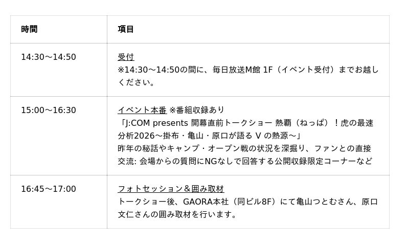 【取材ご案内】「J:COM presents 開幕直前トークショー 熱覇(ねっぱ)!虎の最速分析2026〜掛布・亀山・原口が語る V の熱源〜」