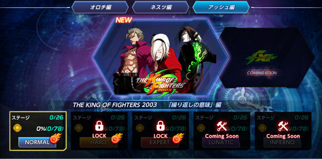 アッシュ編と呼ばれるKOFのストーリーラインから、『KOF 2003』のストーリーを本作のカラーで再解釈した新規シナリオをお楽しみいただけます。各章をクリアしていくことでシナリオを楽しむことはもちろん、各章ごとのミッションを通じて成長に役立つ報酬も獲得できます。