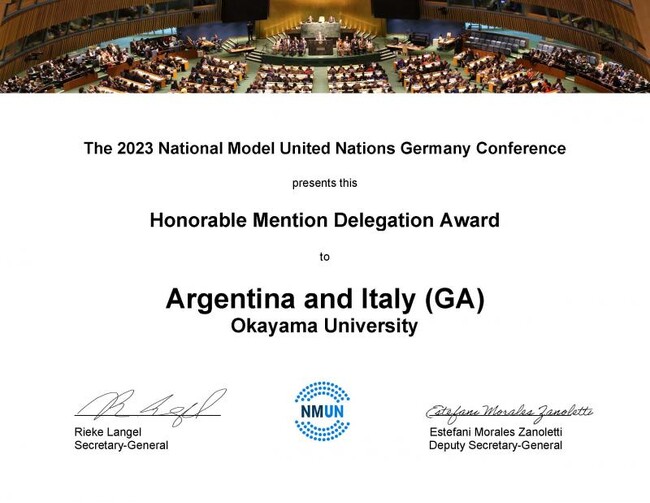 国立大学法人岡山大学(本部:岡山市北区、学長:那須保友)の7人(日本人4人、外国人留学生3人)の学生が、2023年11月19〜25日にドイツのエアフルト大学で開催された模擬国連NMUN-Germany Erfurt 2023に参加しました。アルゼンチンとイタリアの代表として国際政策について討論およびスピーチを行い、決議案を作成した岡山大学チームは、見事に「Honorable Mention Award」を受賞しました。
