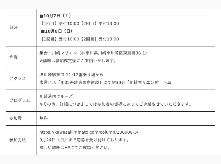 2023年10月7日(土)、8日(日)<集合:川崎マリエン>