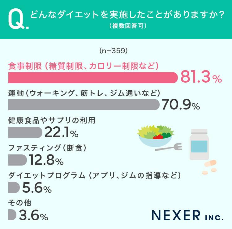 ダイエット経験者の8割以上が「食事制限」、7割以上が「運動」を実施しており、基本的なアプローチが主流であることが分かります。