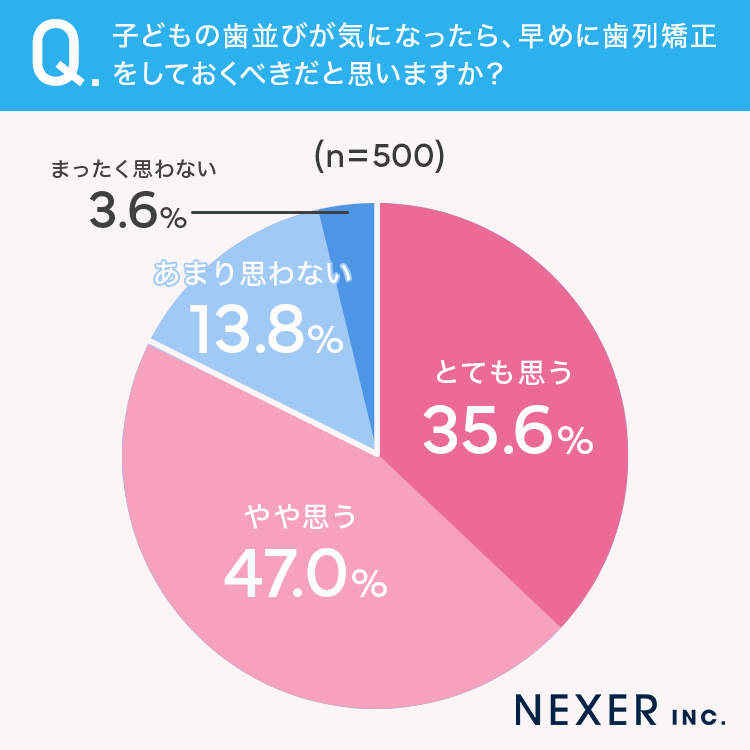 子どもの歯並びが気になった場合、「とても思う」35.6%と「やや思う」47.0%を合わせ、8割以上の親が早期の歯列矯正の必要性を感じています。