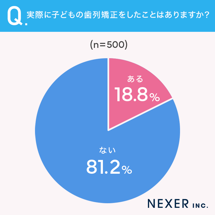 実際に子どもの歯列矯正を「ある」と回答した親は18.8%に留まり、「ない」が81.2%と多数派でした。