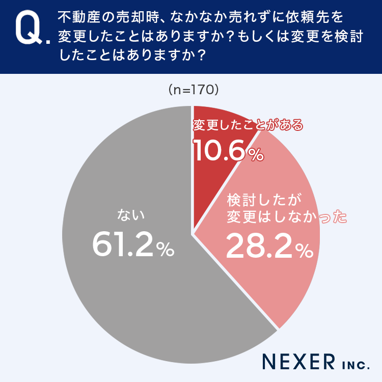 まずは不動産の売却時、なかなか売れずに依頼先を変更したこと、もしくは変更を検討したことはあるか聞いてみました。