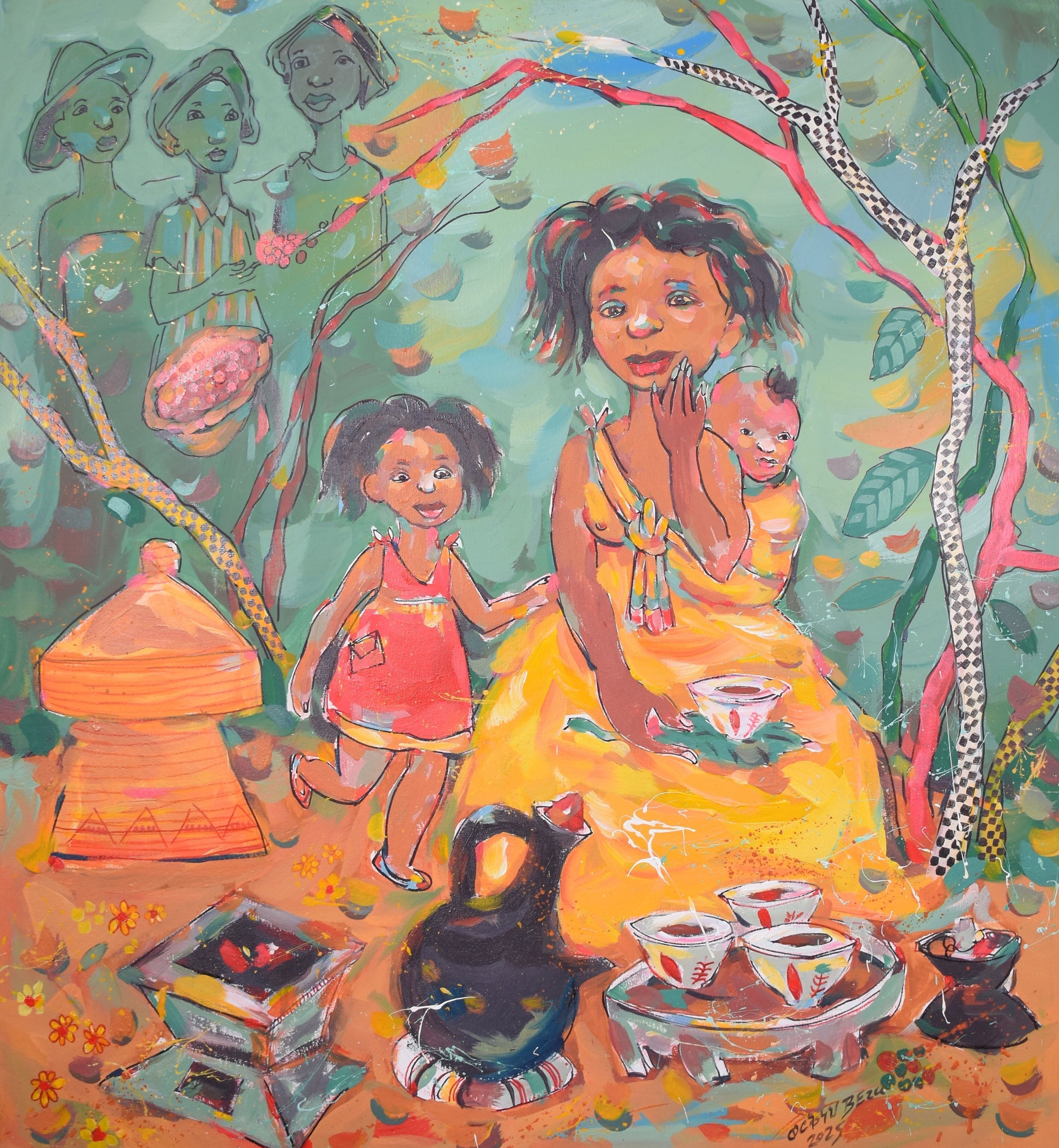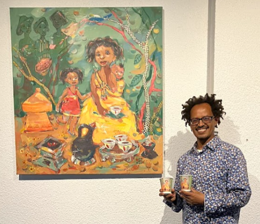 今回デザインを手掛けたのは、エチオピアを拠点に活動する画家、ワークネ べズ・カッサ氏です。彼の作品は、エチオピアの文化や伝統、そこに暮らす人々の温かい日常を、生命力あふれる鮮やかな色彩で描いています。今回のコーヒーカップのデザインはエチオピアのおもてなし文化であるコーヒーセレモニー「カリオモン」の様子を生き生きと表現いただきました。