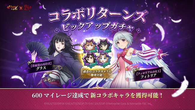 また、ガチャの回数に応じて貯まるマイレージ報酬では、600マイレージ到達でコラボキャラから1体選択して獲得できます。この機会にぜひ手に入れてください。