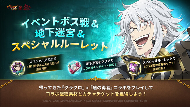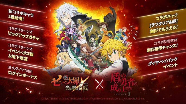 ネットマーブルは、スマートフォン向けシネマティックアドベンチャーRPG『七つの大罪 〜光と闇の交戦(ひかりとやみのグランドクロス)〜』(略称:グラクロ)において、本日4月25日(木)より、人気TVアニメ『盾の勇者の成り上がり Season 3』(以下、盾の勇者)とのコラボイベントを開始したことをお知らせいたします。