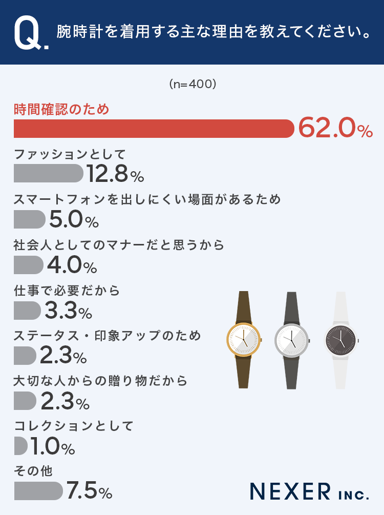 また、着用する理由については62.0%が「時間確認のため」と回答した一方で、デザイン性やファッション性を重視する声も多く見られます。